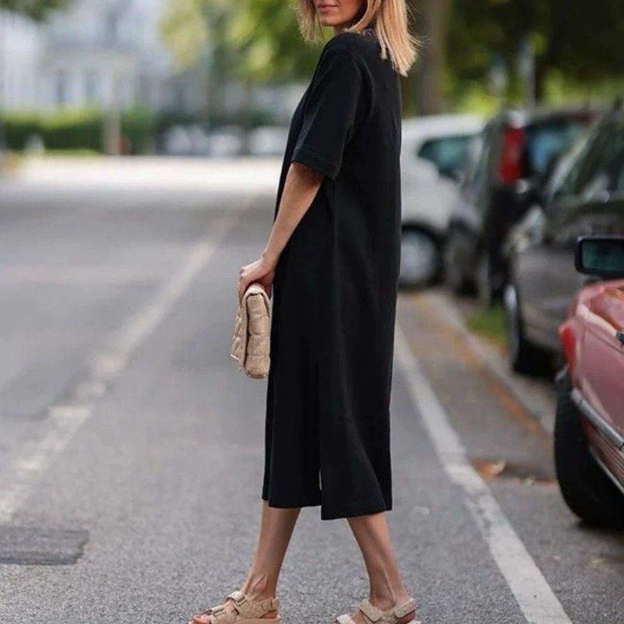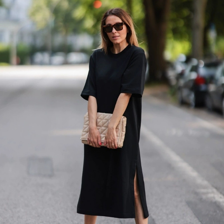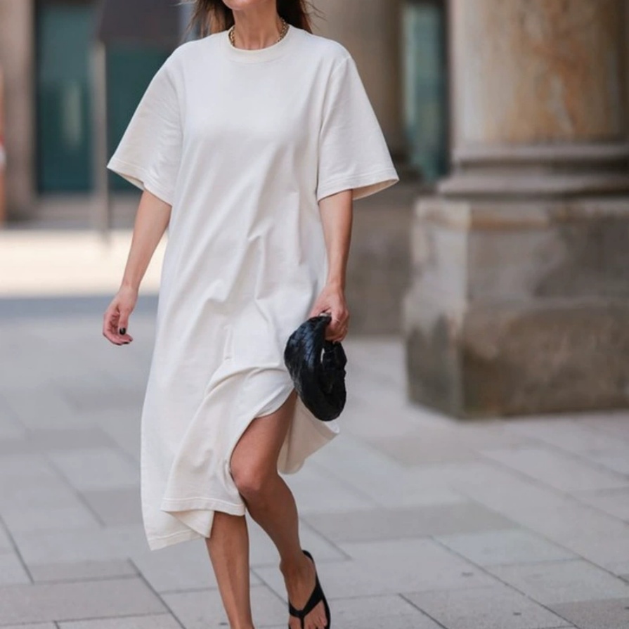 This 2025 early autumn new heavy cotton loose T-shirt dress takes the minimalist ROW style as the design core, accurately meeting the dual needs of modern women for simplicity and sophistication as well as comfort and practicality. The classic round neck design is simple and elegant, modifying the neck line and suitable for various face shapes; the short-sleeve cut is neat and refreshing, balancing the slight coolness of early autumn and the convenience of daily activities. The loose version is highly inclusive of all body types, with excellent meat-hiding and slimming effects, easily creating a relaxed and casual body beauty. The hem length is moderate, allowing free movement, and you can go out easily without careful matching, suitable for various scenarios such as commuting, dating and daily street wear.